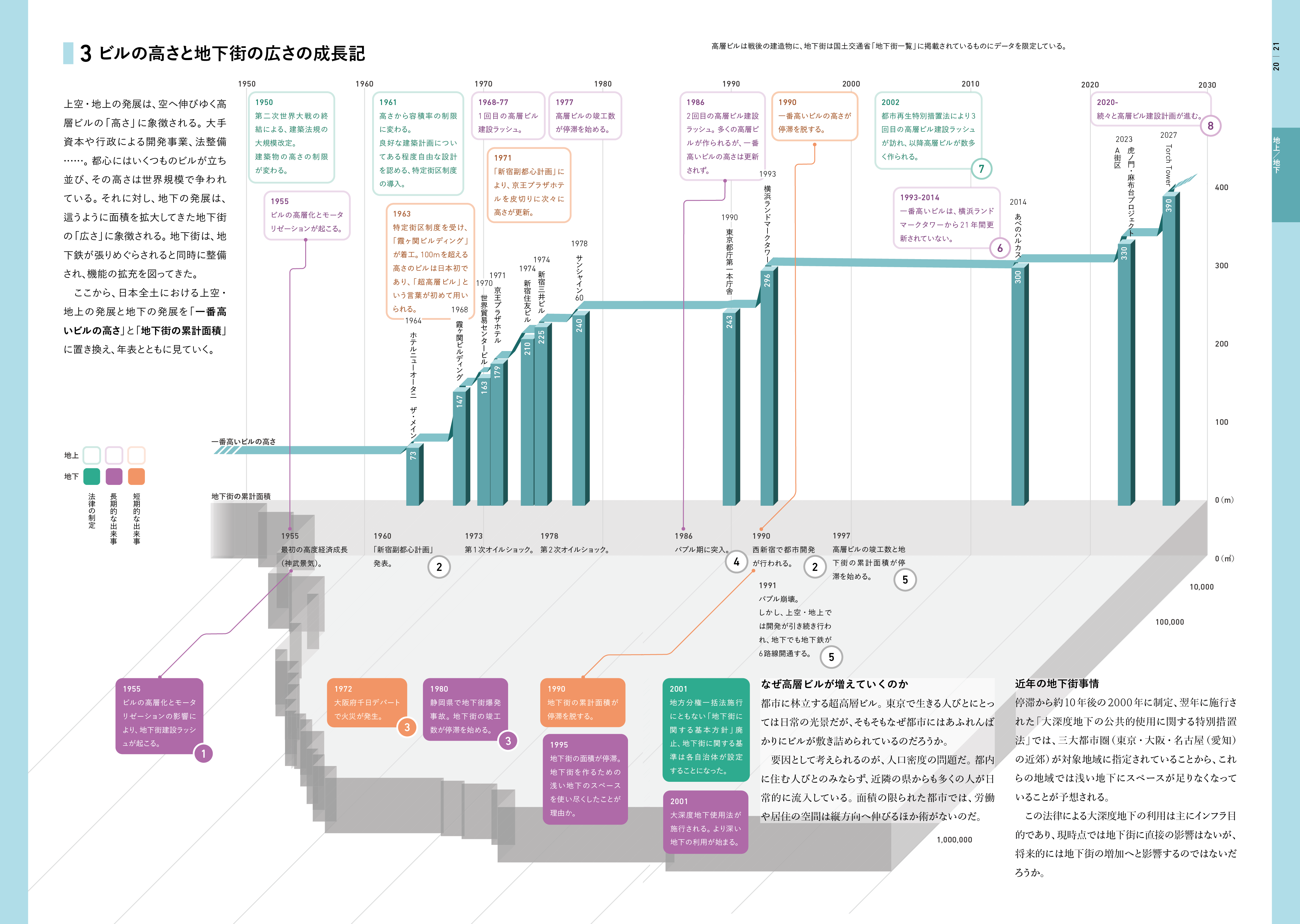 全体のデザインディレクションを担当しながら、個々のページのデザイ ンも行った。自身が担当した特集「地下を這う東京、空へ伸びる東京—都市における垂直・水平方向の発展」では、東京の地上と地下の発展の 連関についてリサーチし、誌面にまとめた。 その中の「ビルの高さと地下街の広さの成長記」では、リサーチの中でのビルの高さ(地上の発展の指標)と地下街の広さ(地下の発展の指 標)の成長の同時性が見開き一枚で伝わるようにデザインした。